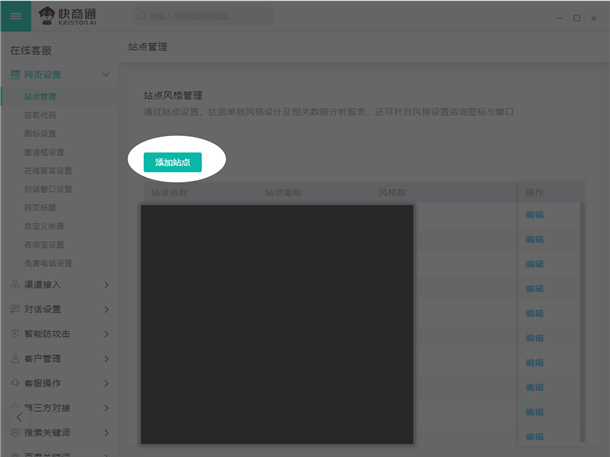 3、點(diǎn)擊“添加站點(diǎn)”隨便添加一個有備案的網(wǎng)站域名(因?yàn)橐^驗(yàn)證),可以添加多個url地址,為不同的頁面來生成不同樣式的客服窗口。